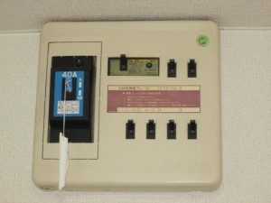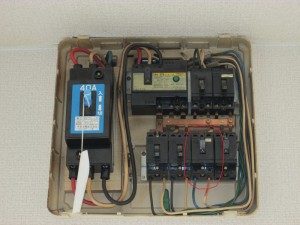 写真右下に囲ってある赤丸の部分、小ブレーカーを100Vから200Vに変換。
