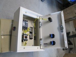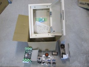 荷物用エレベーターの防護柵のリミットスイッチ反応を「オン」、「オフ」にする制御盤の組み立てです。
