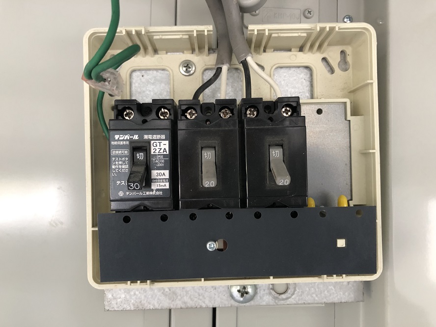 事務所のユニットハウスまで電源線の配管・配線工事が終了したので分電盤を取り付けることになりました。