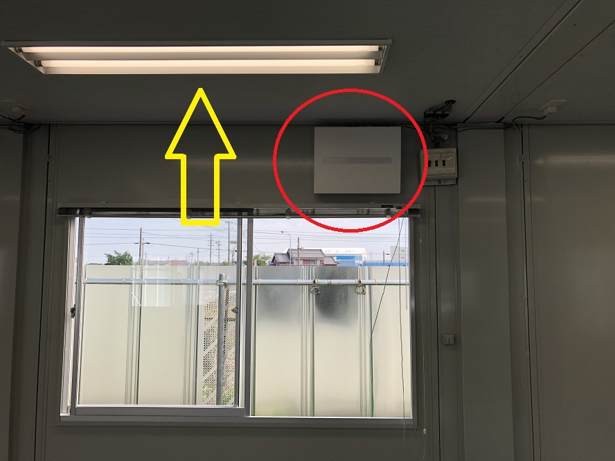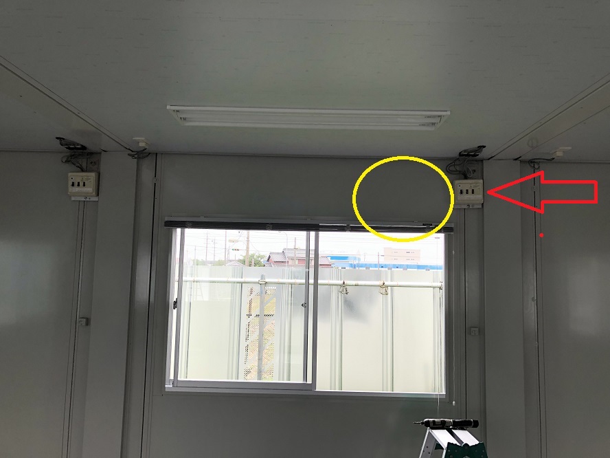 赤い矢印の分電盤はユニットハウス既設の照明・コンセント用の分電盤です。